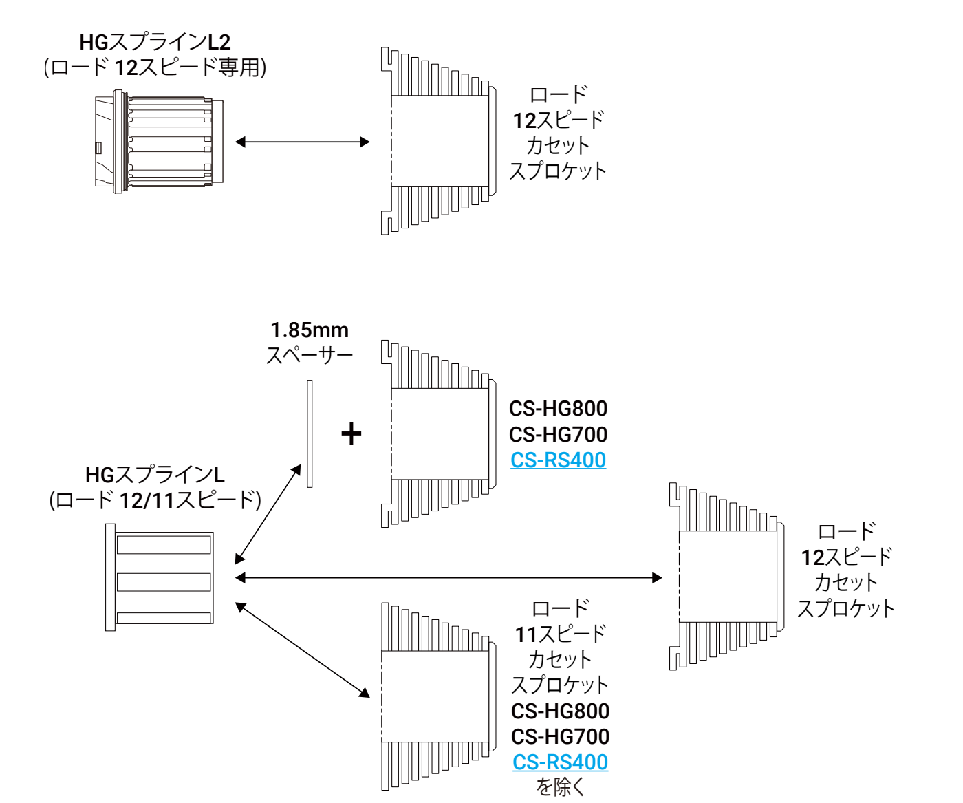 *3 ロード11スピードのCS-HG800 / CS-HG700 / CS-RS400は、スペーサー(1.85 mm)を入れることでHGスプラインLと互換性を持ちます。