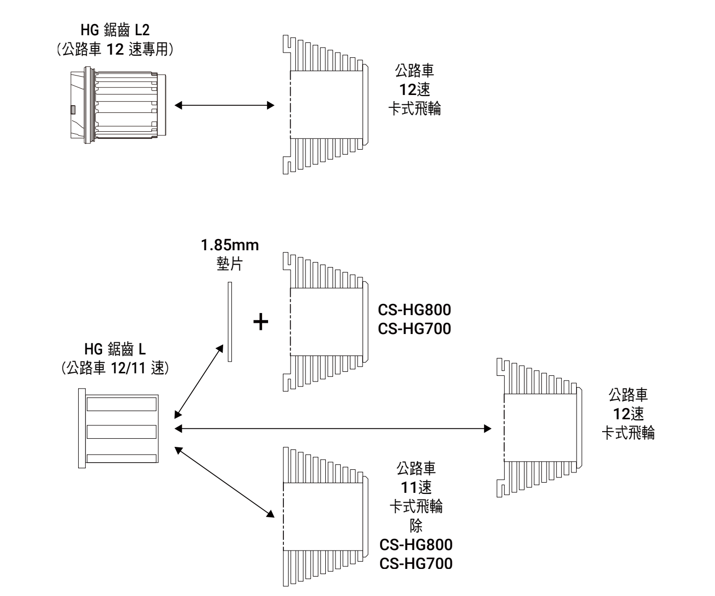 *3 公路車 11 速的 CS-HG800 / CS-HG700 安裝 1.85 mm 墊片後可相容於 HG 鋸齒 L。