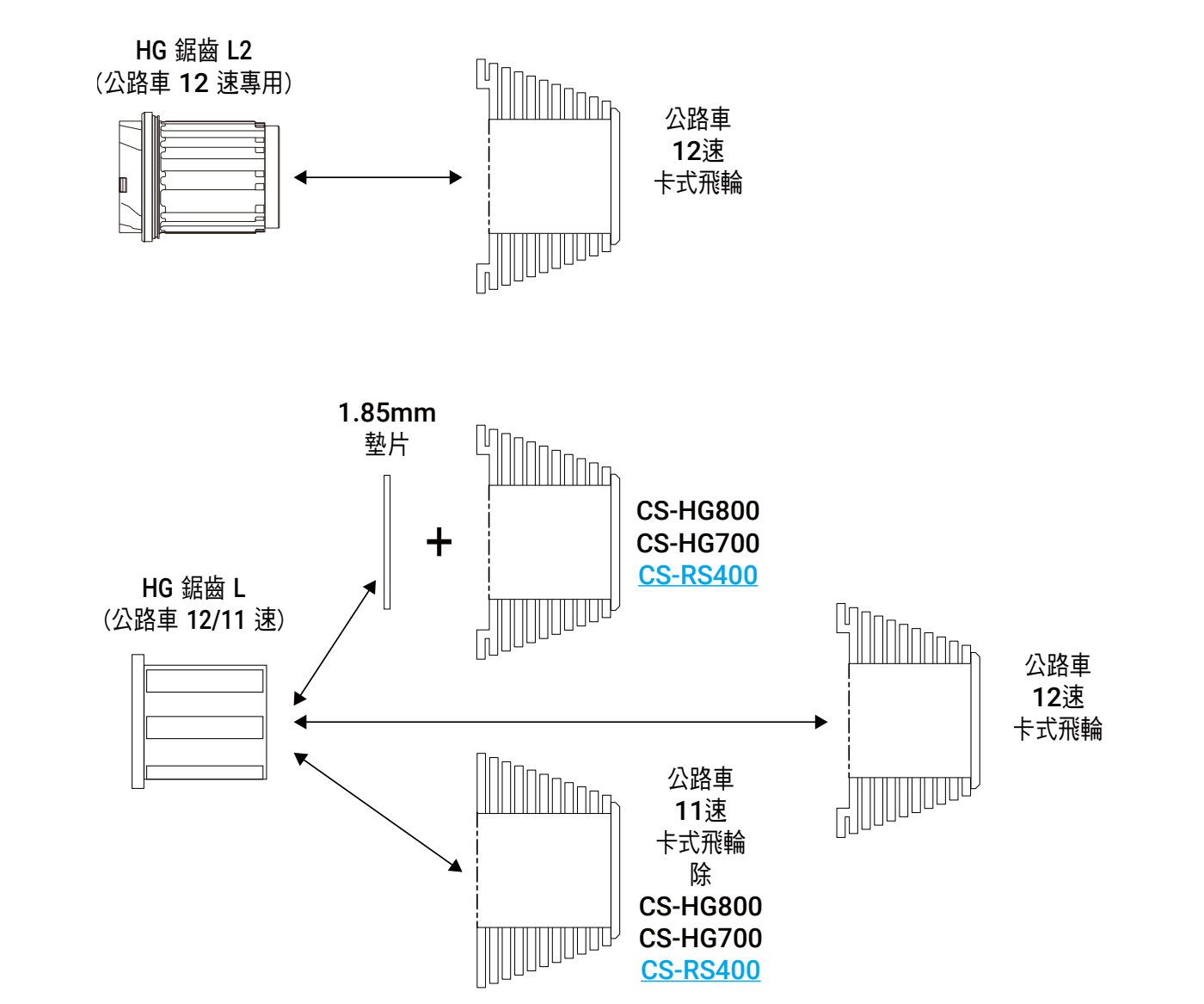 *3 公路車 11 速的 CS-HG800 / CS-HG700 / CS-RS400 安裝 1.85 mm 墊片後可相容於 HG 鋸齒 L。